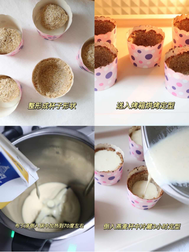 烘烤的时间准备布丁液,布丁液加热到70度左右就可以用啦,倒入烤完的燕麦杯中,再送入冰箱冷藏3小时以上定型