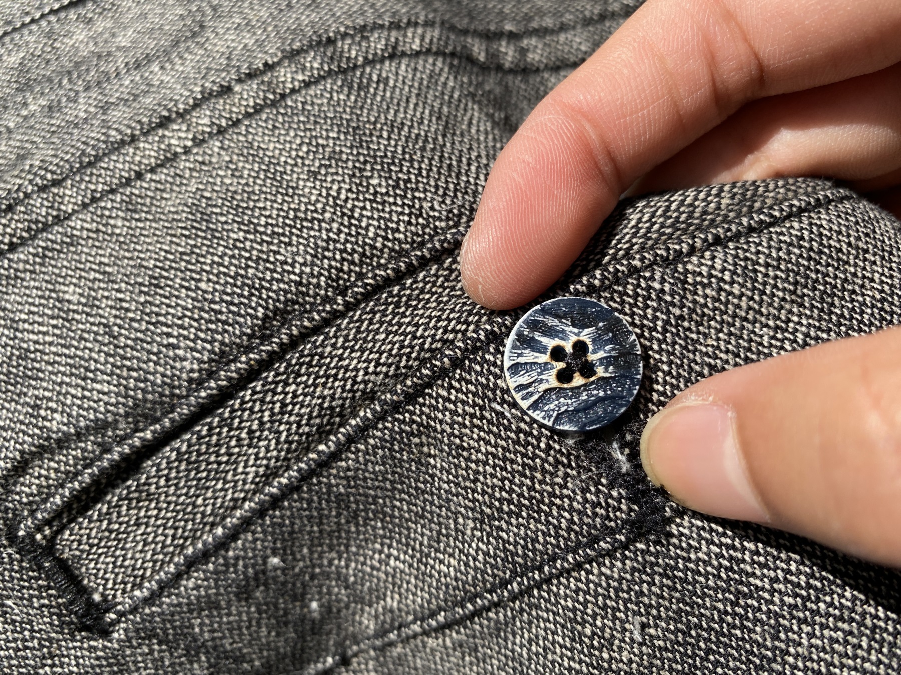 背面双内挖袋 一套希腊产贝克打磨 波浪纹做旧工艺纽扣,极其细腻的质感