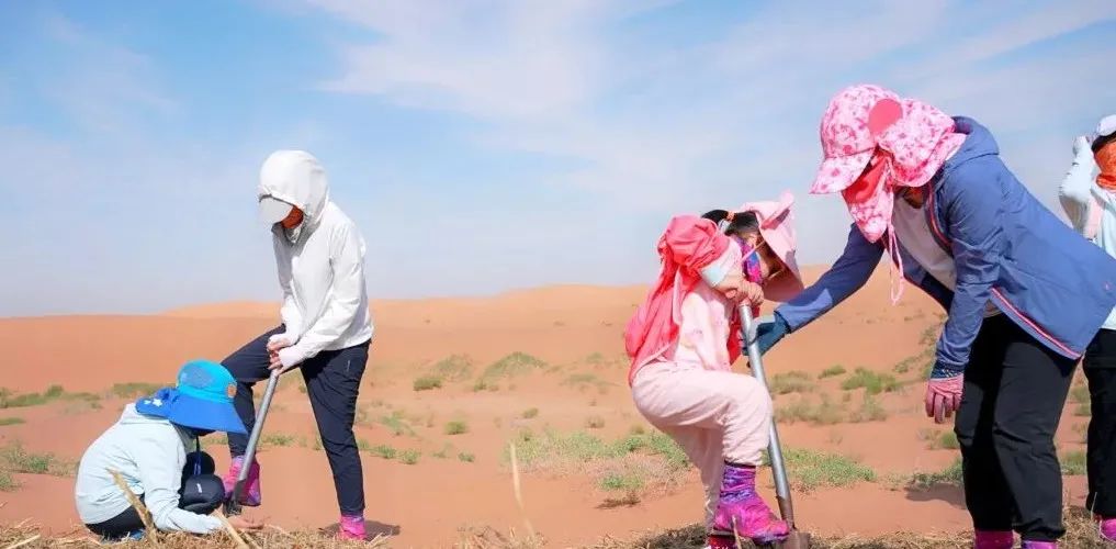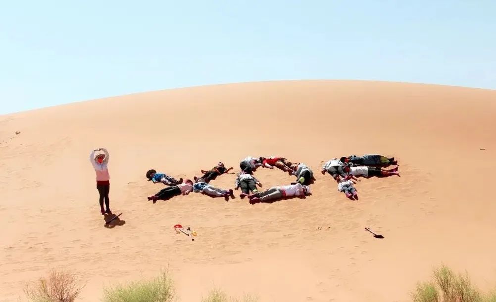 在沙漠,孩子们做麦草方格,学习防沙治沙的知识,并亲身实践。