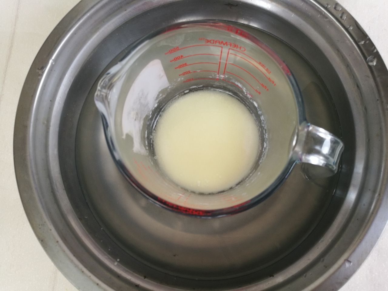 5、打发到变色就把打蛋盆拿出来,把混合好的牛奶溶液放在热水里保温