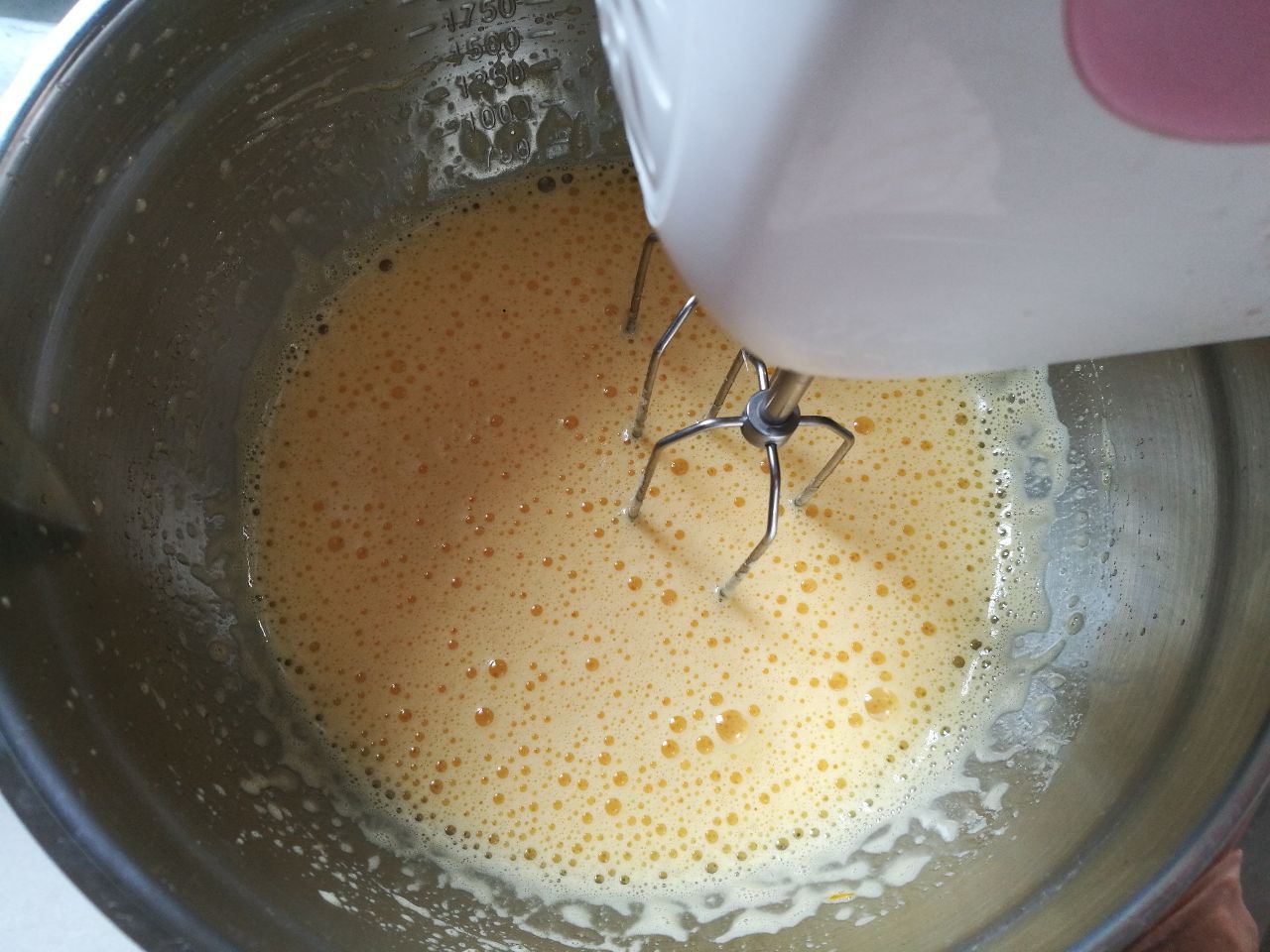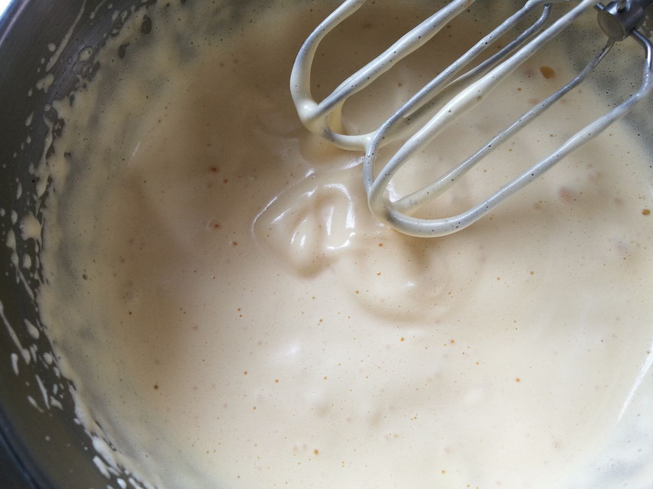6、鸡蛋液继续打发至浅白色,划8字不消失
