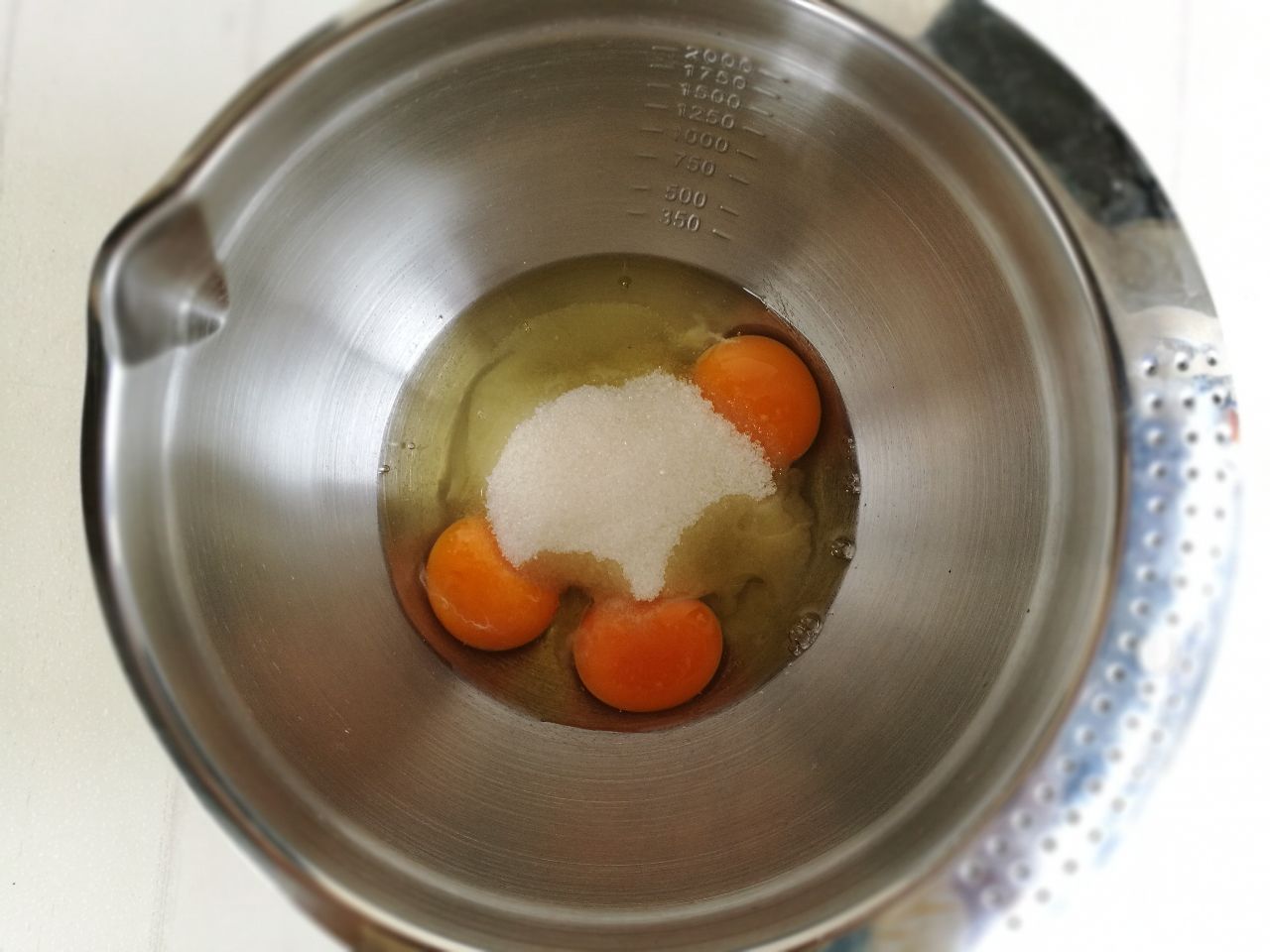 3、鸡蛋加入细砂糖混合均匀