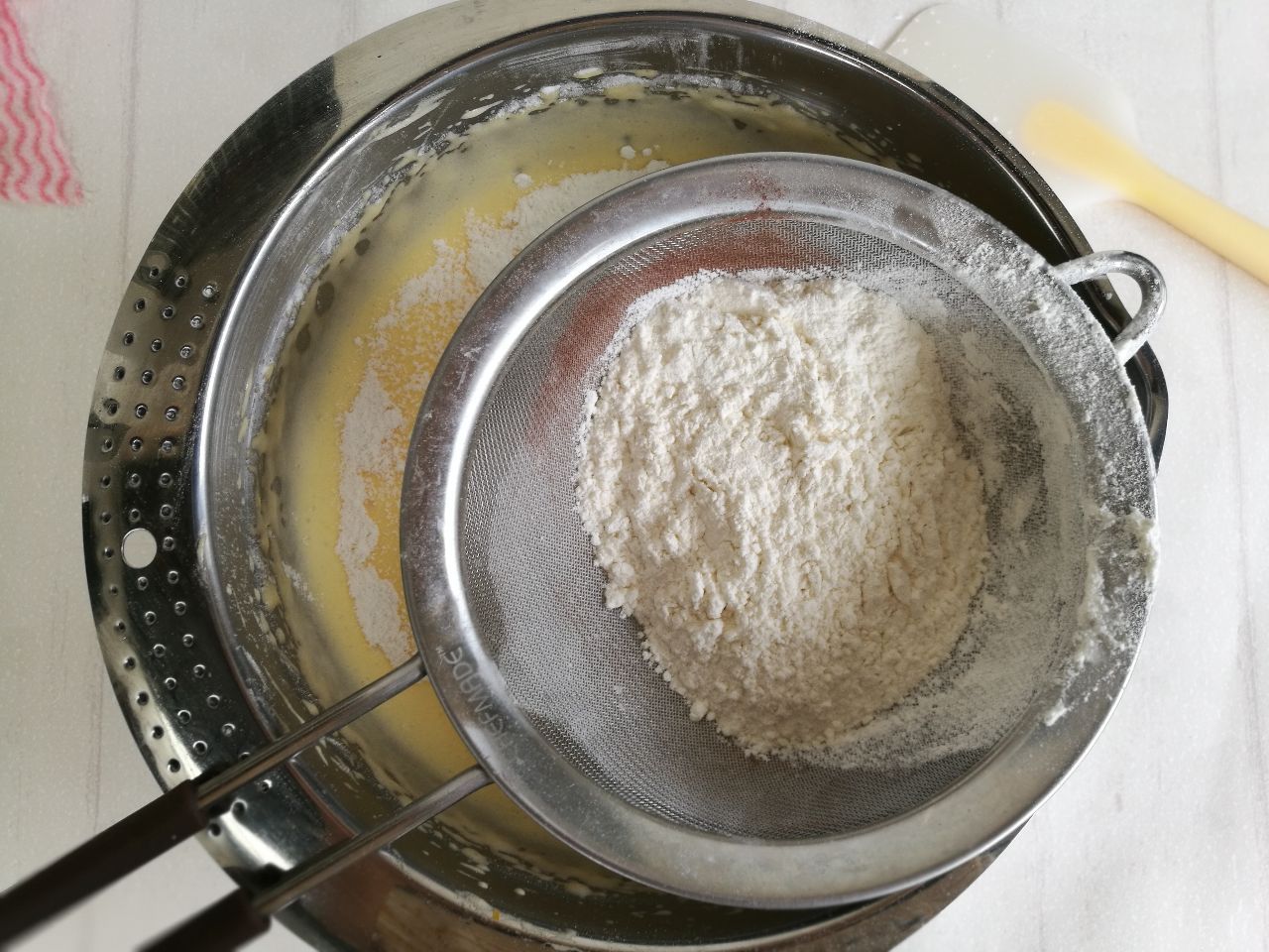 8、加入过筛的蛋糕粉,用刮刀从中间翻拌至无颗粒状态