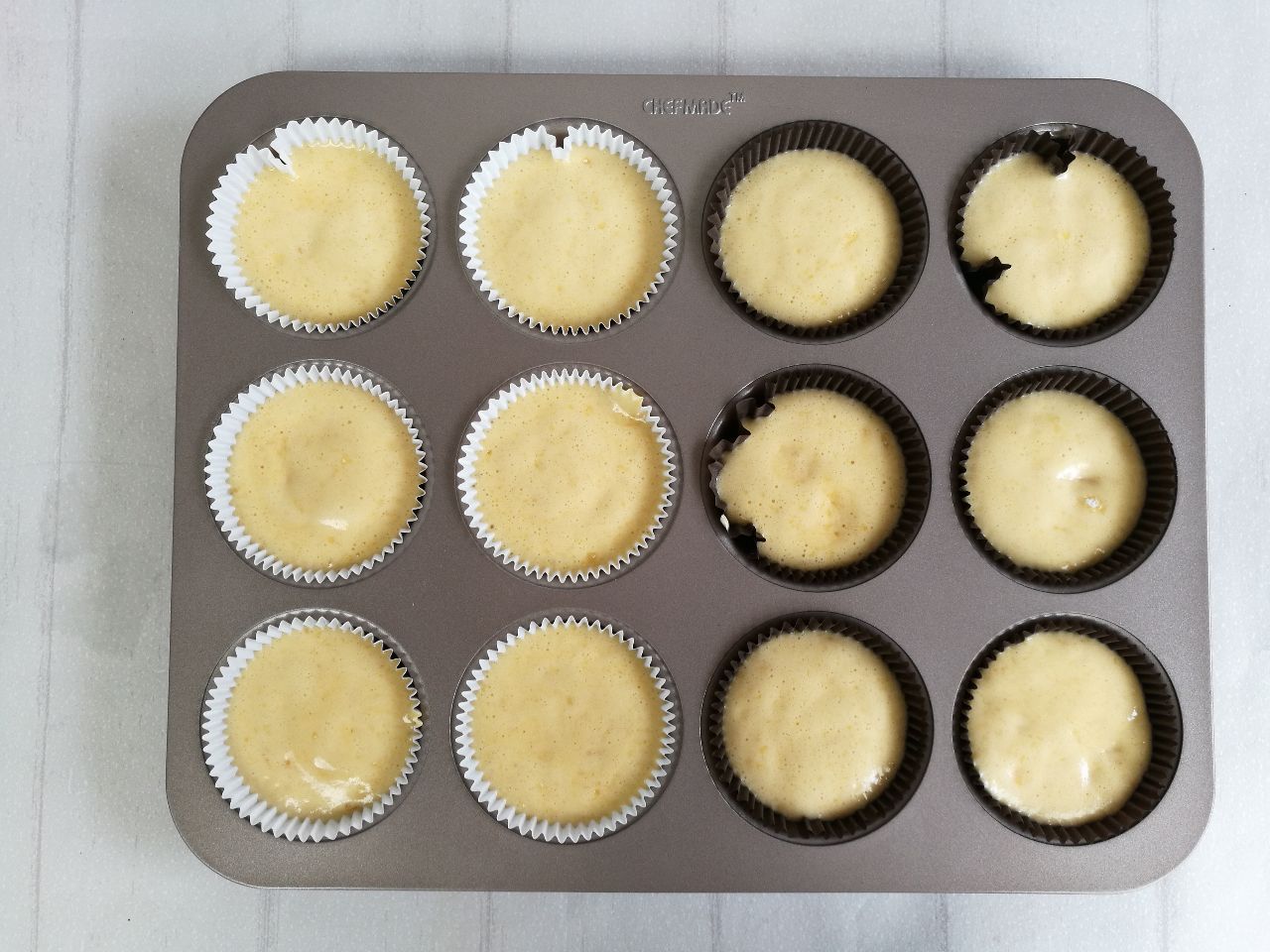 9、装入裱花袋,挤入蛋糕模具中