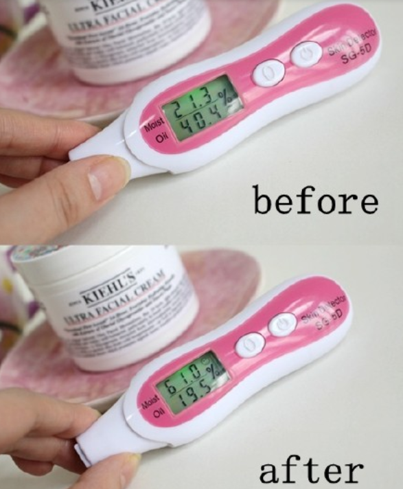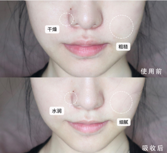 保湿力超强;用水分测试仪做涂抹前后对比,水份↑了40%,油分↓了20