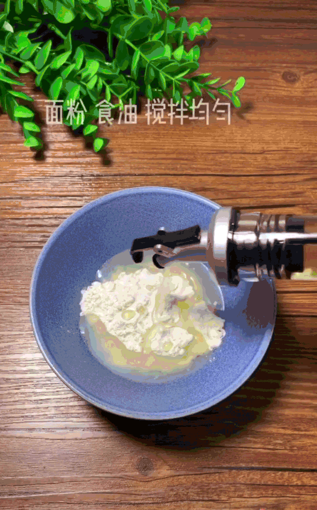 准备油酥,将面粉和食用油搅拌均匀(搅拌一点够用就可以)。