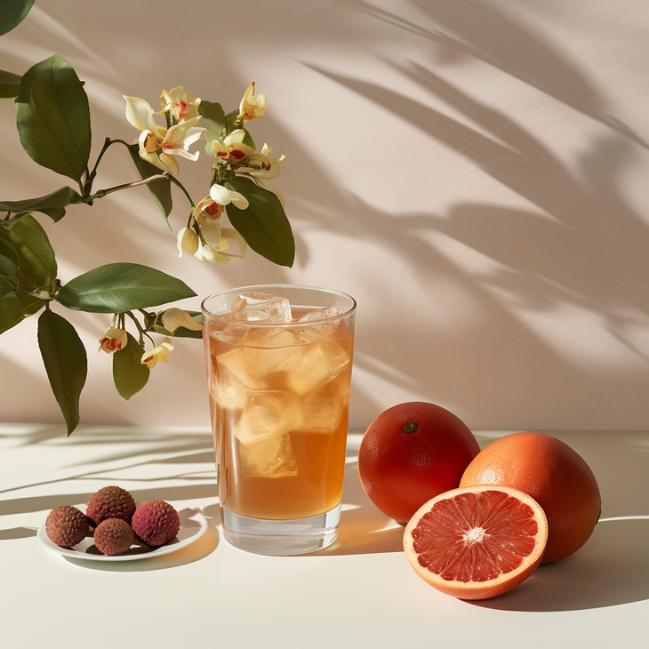2、取一干净杯子,往杯子里放入荔枝肉和西柚片,捣几 下出汁。