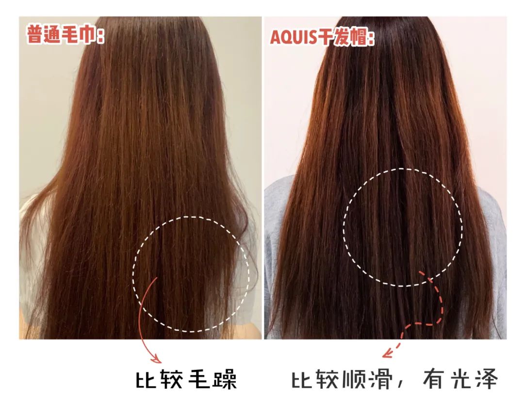 另外,刚洗完头,毛鳞片是打开的,用AQUIS干发帽不需要擦拭揉搓头发,避免因为摩擦损伤毛鳞片,吹干也明显不那么毛躁。