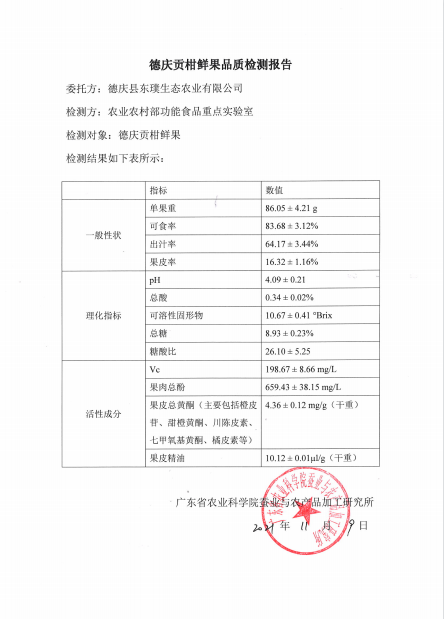而德庆贡柑则向来以果肉清甜香蜜、高糖低酸、风味浓郁著称,一直以来都是风味极佳的鲜食水果。在全果营养方面,本次送检的德庆贡柑一共检测了一般性状、理化指标、活性成分三个大项,包括可食率、出汁率、可溶性固形物、糖酸比、Vc含量、果皮总黄酮、果皮精油等13个具体项目,其中多个检测项目达到业内一流,足以表明德庆贡柑的果肉和果皮都含有丰富的营养价值。“德庆贡柑是果肉和果皮兼优的品种,可实现‘一果两用,品果留皮’的发展模式,这是它的一大优势。”徐玉娟说。