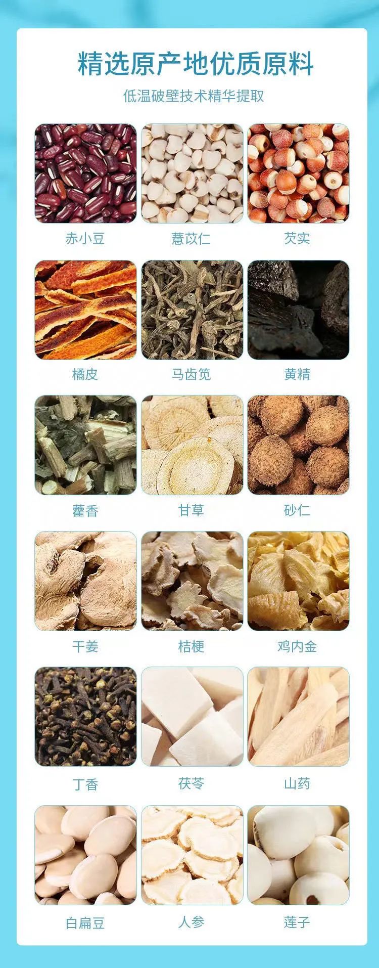 除了赤小豆和薏米的祛湿气组合,还复配了其他16种天然草本原料!包括人参、芡实、茯苓等,营养超级丰富。