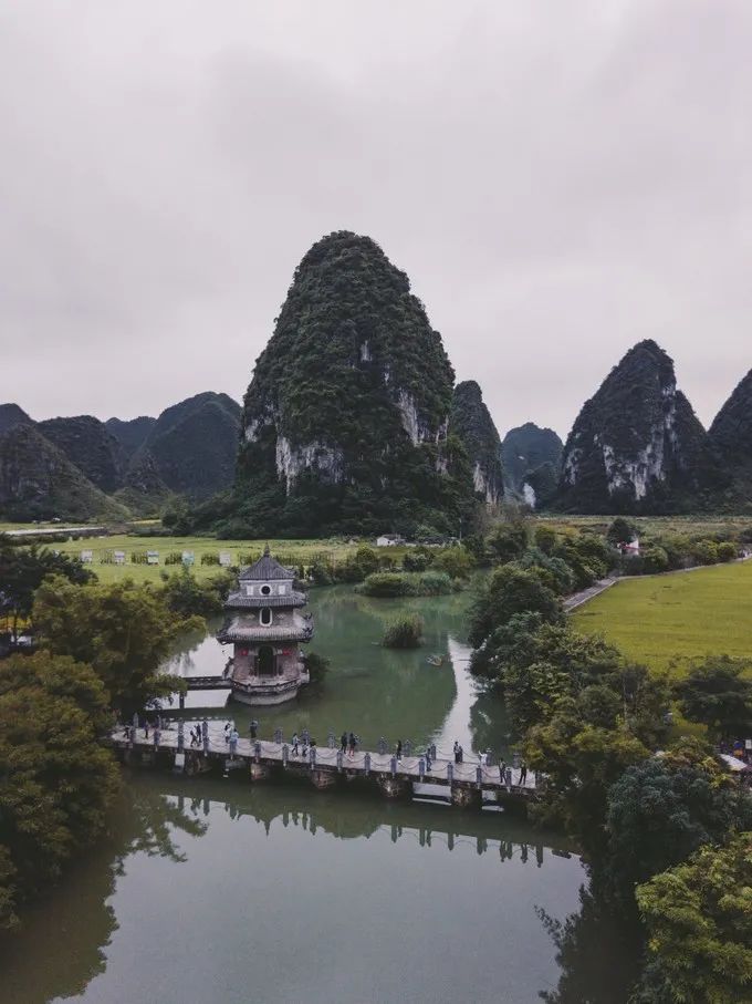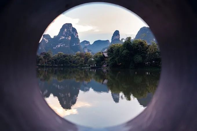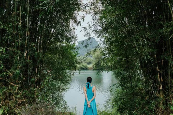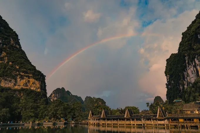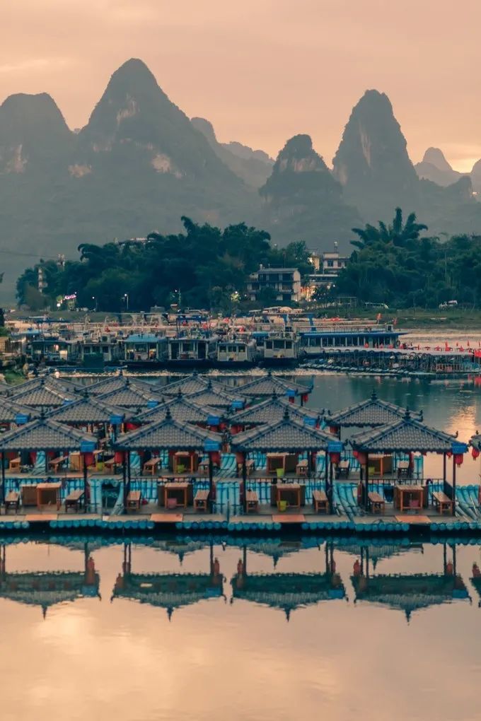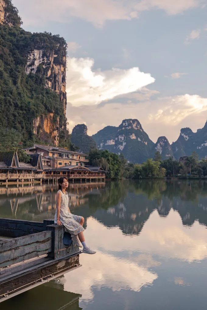 看完表演,雨也差不多停了。“雨霁初晴,碧空如洗”,雨后的天空变得更加通透,“群峰倒影山浮水,无山无水不入神”,这正是广西山水的真实写照。山峰倒映在平静的水面,仿佛翡翠碧玉。偶尔有鸟掠过,泛起小涟漪,打碎了平静的倒影。
