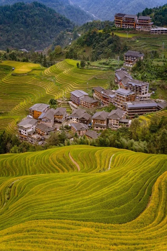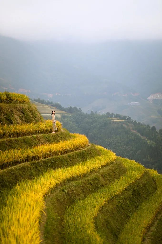 龙脊梯田是我此行最大的惊喜,10月份黄绿相间的千层天梯,仿佛从云霄散落,铺满大地。在日出晨雾中,梯田像是蒙上了一层面纱,更加惹人怜爱。
