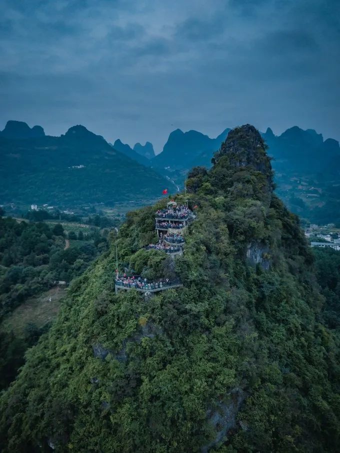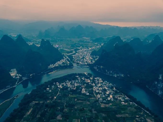 离开鹅泉,我们赶往南宁。到南宁的时候已经是晚上9点,进入城区后的交通简直让我崩溃。外地人千万别来南宁自驾!!车多,电瓶车多,红绿灯指示复杂,车道更是复杂。南宁休整,第二日乘高铁去往阳朔。到达阳朔民宿已经快傍晚五点,今天的行程只有一个,那就是去老寨山看落日。老寨山是一个野生景点,不要门票,位于兴坪码头的最高处,在这里能欣赏到漓江第一湾,是欣赏落日的最佳位置。但是民宿一直极力劝说我们别去,因为 10 月份天黑得早,老寨山不是景区,没有路灯没有围栏,爬上去还行,下来天黑的话不安全。尽管我很想去,但是最终还是被劝退了。我们租了辆小电驴,开到了兴坪码头。兴坪码头不能算是个景点,但是这里的风光很不错,很合适航拍,在码头可以看到漓江第一湾。
