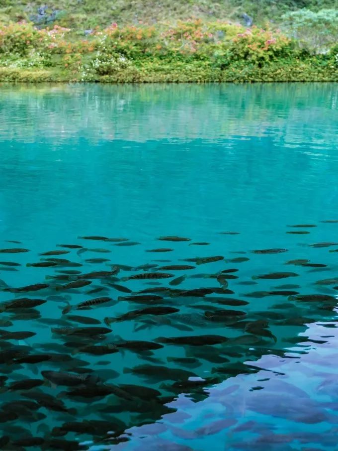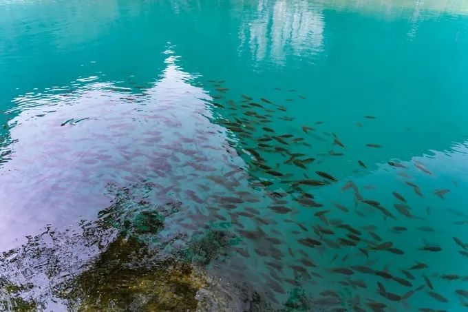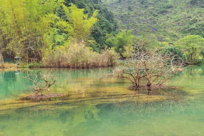 鹅泉青山环绕,水清如镜,盛产鱼虾,还有几只肥硕的大白鹅在水里嬉戏,乍一看的时候,有点“低配版” 九寨沟 的味道,因为泉水的颜色是青色的,非常清澈,泉中立着几棵枯树枝,倒映在水里 。