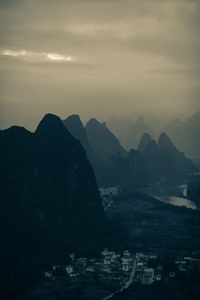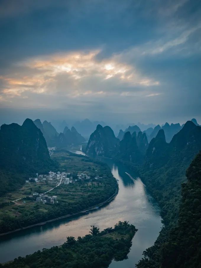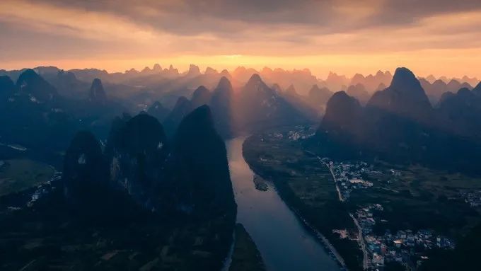 入秋之后,广西能看到日落日出是比较难得的。今天运气不错,看到了一点点落日的耶稣光,后期调的色调浓了一些。江水两侧的山峰高且险,大气悠远,漓江的喀斯特地貌是最美的。