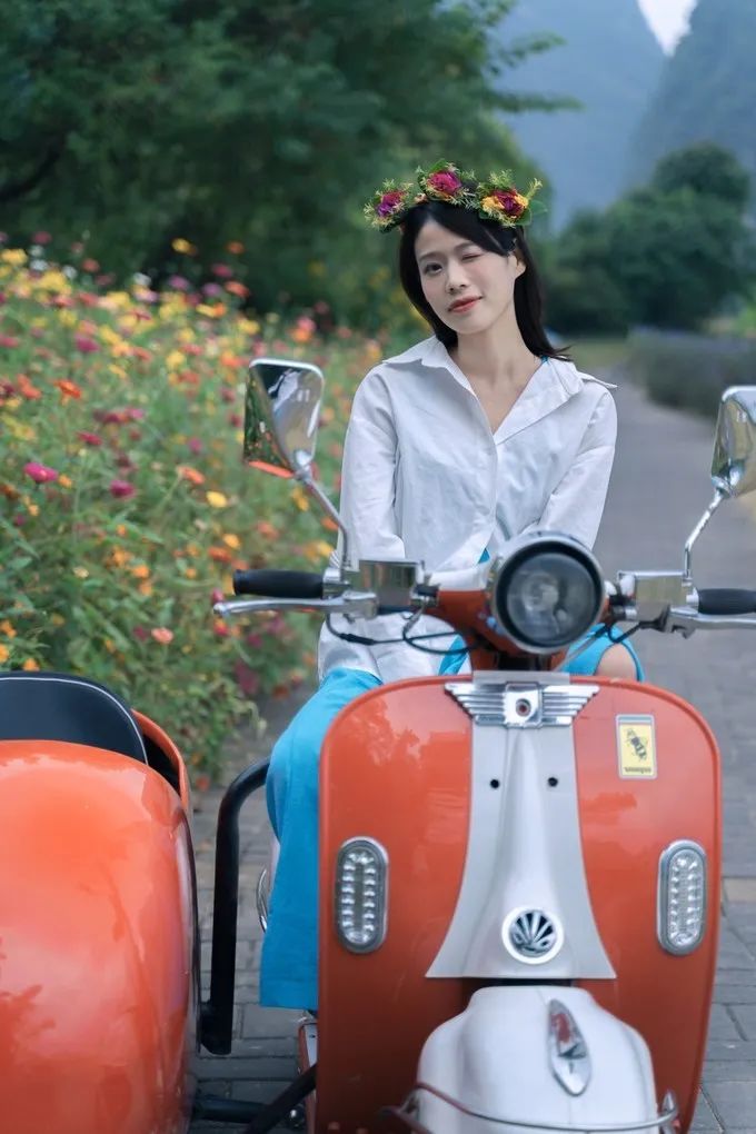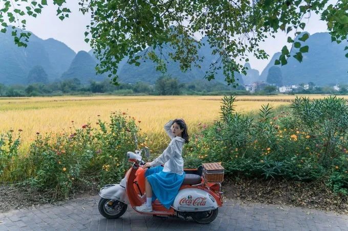 吃过亏之后,我总结了经验,告诉你们正确的打开方式是什么。如果要骑行,强烈推荐遇龙河骑行,那里才是真正的人少景美。从万景码头下来后,租上电瓶车,开过工农桥,沿着遇龙河行驶 1 公里左右,有一条遇龙河步道。这条步道左边是遇龙河,右边是稻田,路两边还种着鲜花,这才是我心目中适合骑行的路。这里能看见不断有竹筏漂过,在河边拍照很好看。