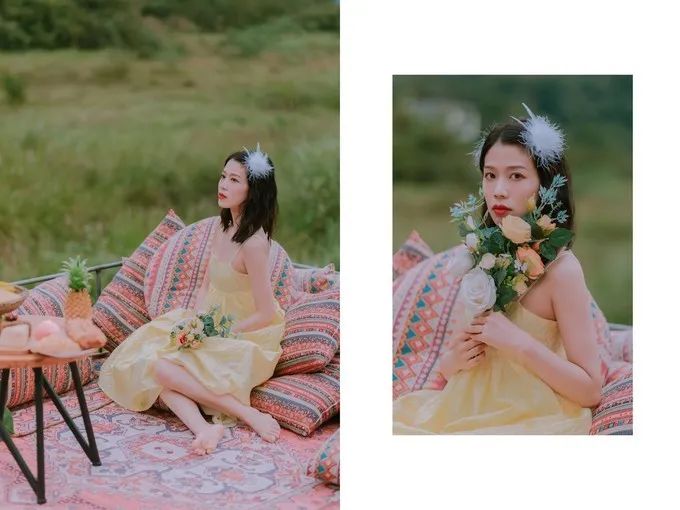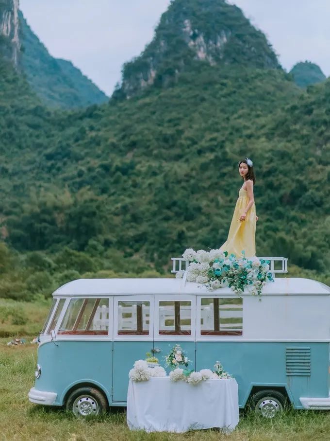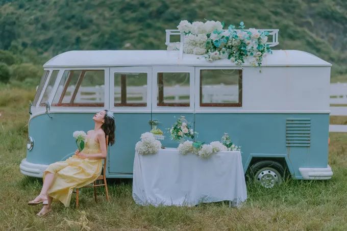 我最喜欢的是小清新风格的绿色面包车,颇有泰国清迈 的感觉,可以爬到顶上去拍照。周围有很多假花,这个场景布置得非常适合拍小清新婚纱。土耳其风格的地毯也不错,面向山谷,拍个背影,最里面还有一个马场,单独收费,其他的场景还有一个白色帐篷、钢琴,浴缸、鸟窝等,每个地方拍一遍能花上 1 小时。