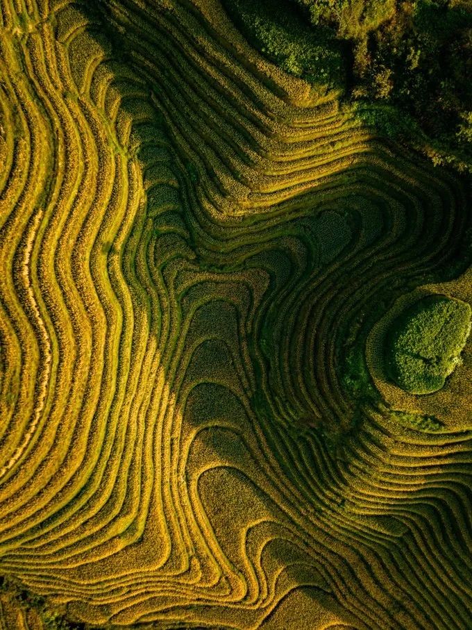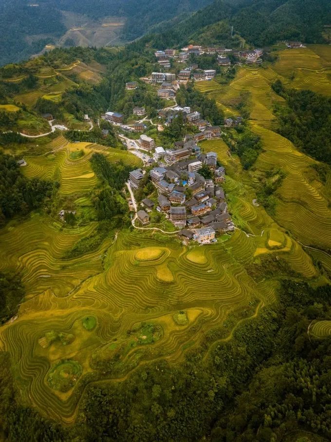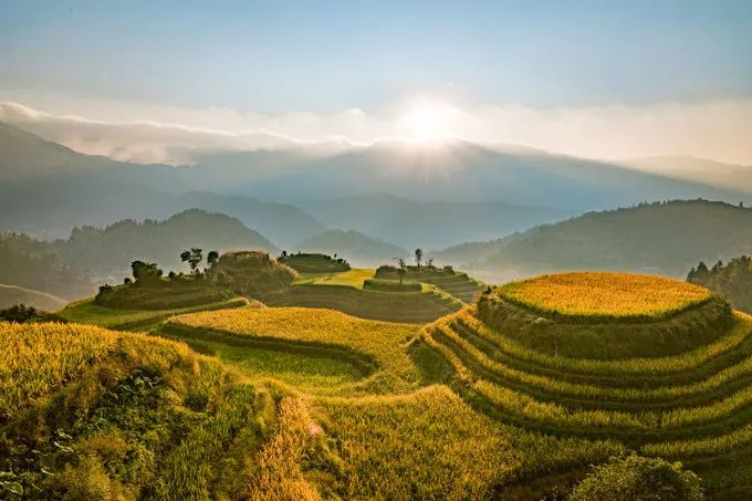 早上醒来太阳已经到了山顶,立马把乔治叫起来航拍,有了好天气龙脊梯田的景色真的是绝美,它也是我此行期待超高的景点。千层阶梯就像千层蛋糕一样,如果是夏天,还是抹茶味的千层蛋糕。秋天变成金黄色后,在阳光照射下,给人很温暖的感觉。不知道有没有人数过,是不是真有千层。