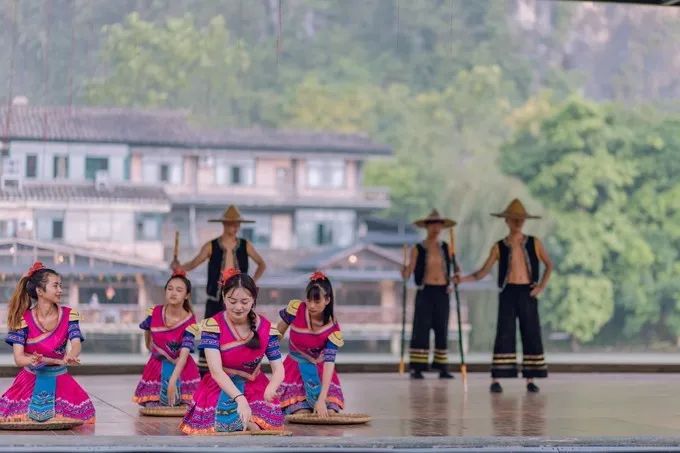 刚进景区,突如其来一场暴雨。我们没带雨伞,心情也犹如这天气低到谷底,觉得80块的门票也跟着打水漂了。只好在棚下躲雨,正巧 17 点的壮族民俗表演开始了。表演的都是一些年纪不大的男生女生,陆续展示了男女生互生情愫的场景,还有栩栩如生的大鹏展示,全程大概半小时。