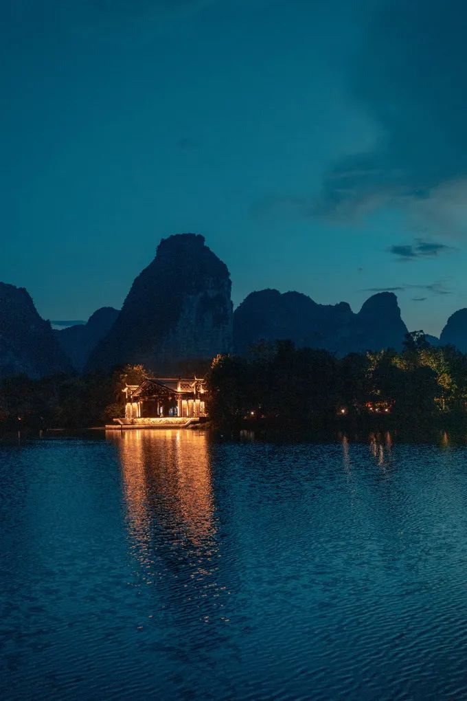 黄昏褪尽,夜晚楼阁的灯光亮起,山的一侧也照上了光,明暗交替。仅看这一小方山水之间,竟有华灯初上的意境。