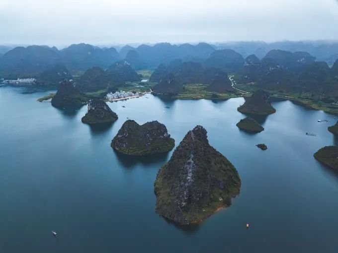渠洋湖是一个大型的喀斯特高原湖泊水库,湖长 15 公里,最宽处有 1 公里,湖面面积有 15540 亩。站在湖边只能看到部分景色,想要一睹全湖胜景,除了航拍,还可以泛舟湖上,置身其中,“落霞与孤鹜齐飞,秋水共长天一色”的美景尽收眼底;体力好的,也可以环湖骑自行车,览遍不同路段的景色。可惜我们遇到阴天,不然能看到日出或者日落,景色一定会更美。