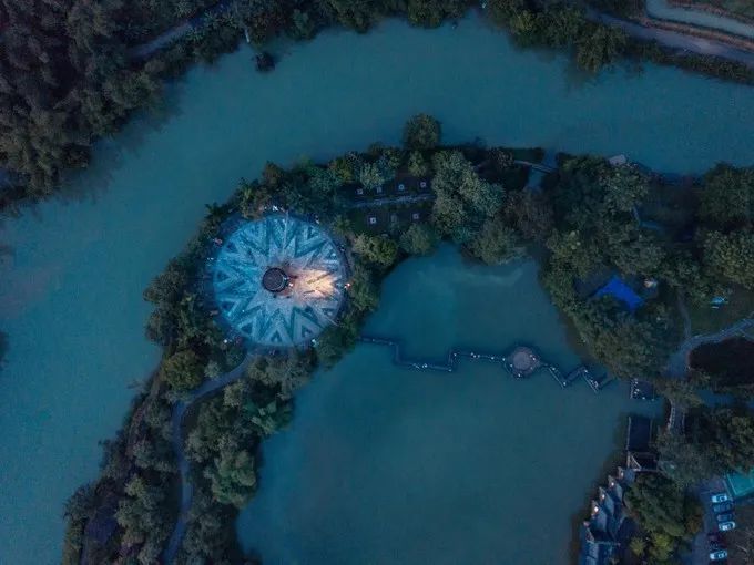 鹅泉航拍并不好看,因为水比较浅,有水草,所以整个泉水的颜色不一致。鹅泉中心是怡心亭,一边连着石桥,一边是荷叶形状的阶梯,设计颇有诗意。