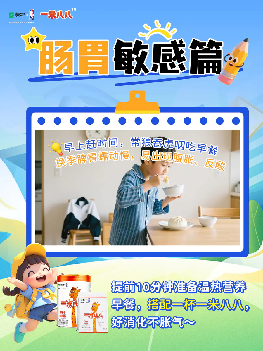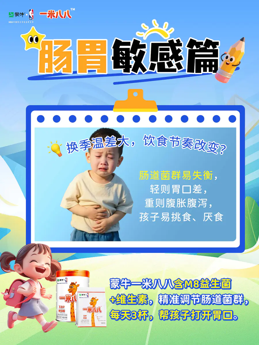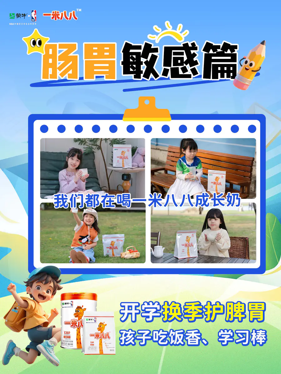 🎒娃开学季遇上换季🙇肠胃敏感怎么办?🥛每天早晚一杯蒙牛一米八八,富含母乳益生菌M8+原生赖氨酸+GOS+FOS+HMOs,多维营养🍚帮孩子养脾胃、开胃口,吃饭香,身体棒~