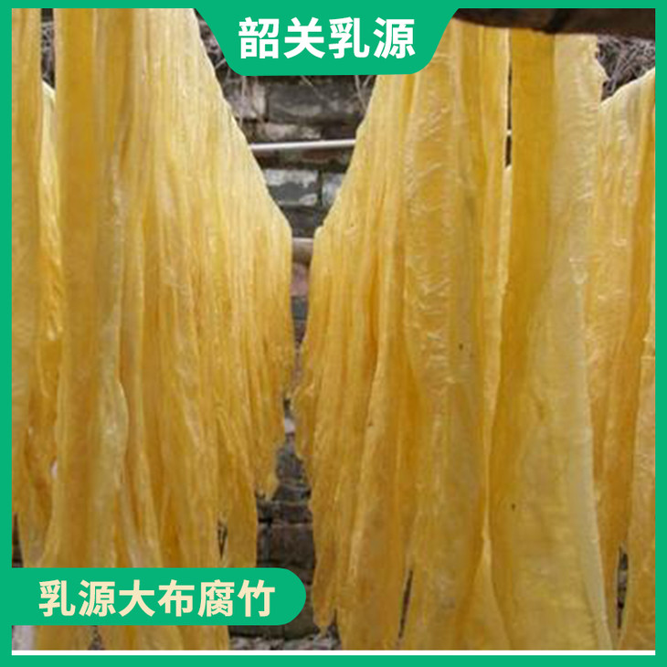 腐竹系黄豆系列产品之一。腐竹精选本地产优质黄豆,用山泉水配以传统的制作工艺,厚簿均匀、清香可口、营养丰富、久煮不烂,可作素菜、上汤。大布腐竹与豆腐的制法有点类同。将黄豆粗磨,去皮,这样做出来的腐竹才纯粹而少杂质,色泽也更讨喜;将去皮黄豆泡发,加入适量清水,磨成豆浆,过滤豆渣,煮沸,自然摊凉,豆浆表面就会形成一层凝结的薄膜,用竹片切开薄膜边缘,中间再划一刀,提起挂到竹竿上,一条新鲜的腐竹基本上就成形了。传统的大布手工制作腐竹要经过十道工序:一洗豆,二浸豆,三打浆,四隔渣,五拧浆,六煮浆,七铲边,八提膜,九挂灶,十晒晾。