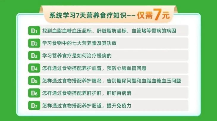 本次课程,将通过7天时间,针对血糖血脂异常、肥胖、心脑血管等问题,提供有针对性的食疗方案,帮你调理好身体慢病问题,也为你的家庭多一重保障。