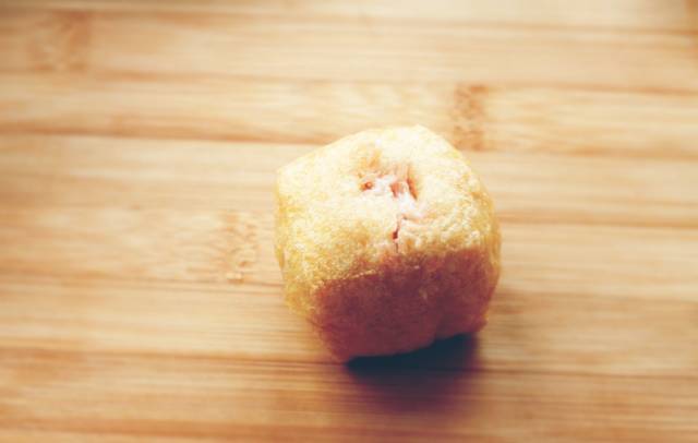 3、把油豆腐切个小口,把羊肉馅酿入其中;如果是卤水豆腐,可直接汆丸子;