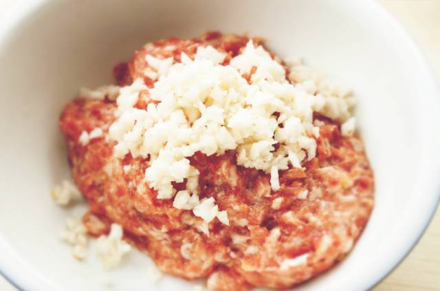2、把姜水倒入羊肉馅中,加一捏盐,搅拌上劲,再放1勺葱花,搅拌均匀后放冰箱中冷藏10分钟;
