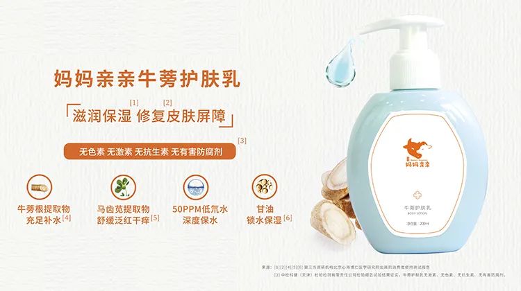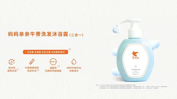 妈妈亲亲牛蒡洗发沐浴露(二合一)采用极简配方温和清洁,PH值6.4呈弱酸性更接近于宝宝的肌肤酸碱度,能够保护宝宝天然皮脂膜。一冲即净、方便快捷,给宝宝洗澡不再是麻烦事儿。