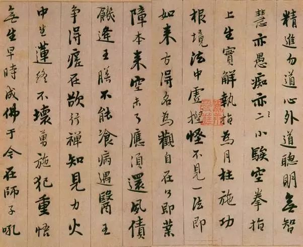 一般情况下,作品的行距要宽,字距要紧。字忌并列,要错开。节数间有空隙,排列组合要有节奏,大小字参差,突出中间书眼。米芾、唐寅、憨山大师等精于此功。