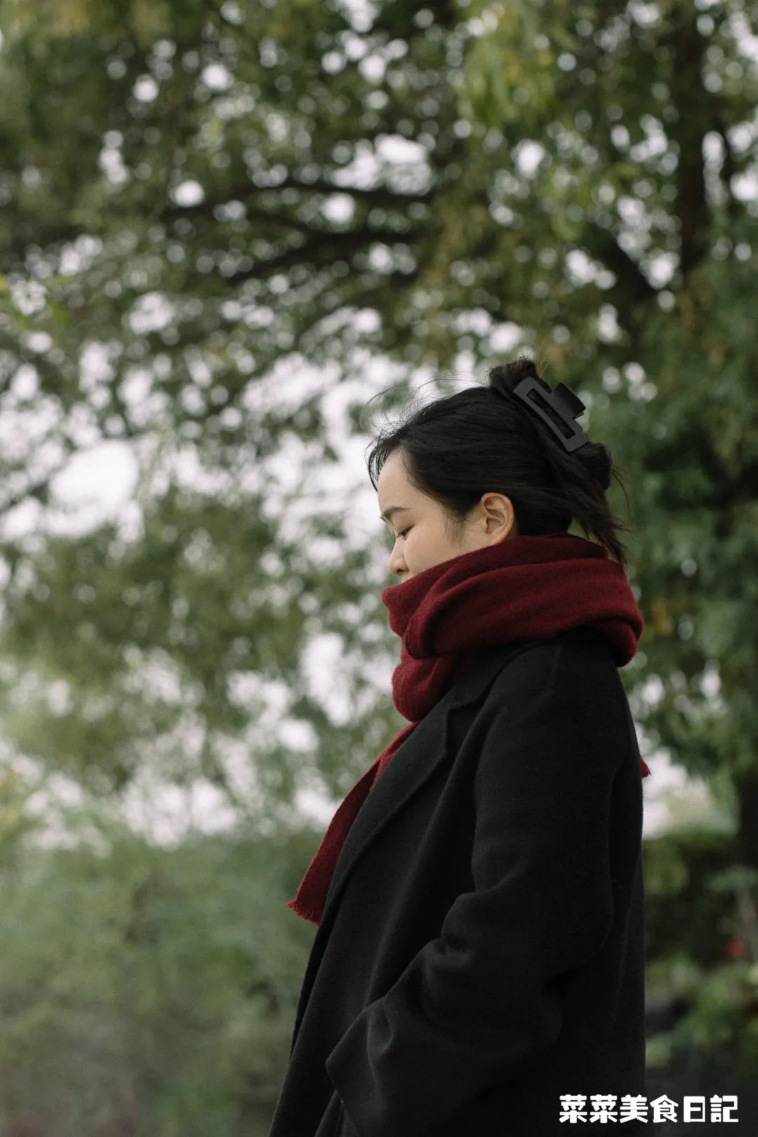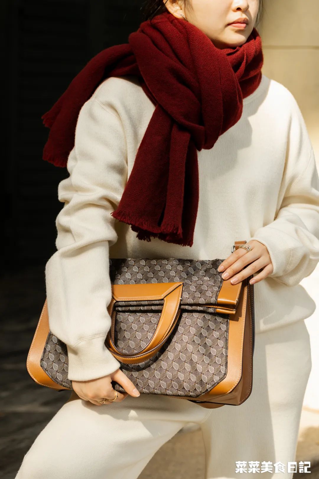 冬天的大衣、外套大多颜色偏深,脖间有浅驼、勃艮第红的点缀,一下就点亮了。