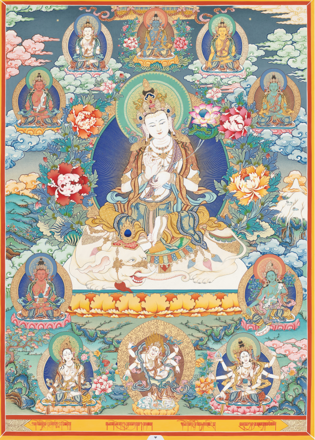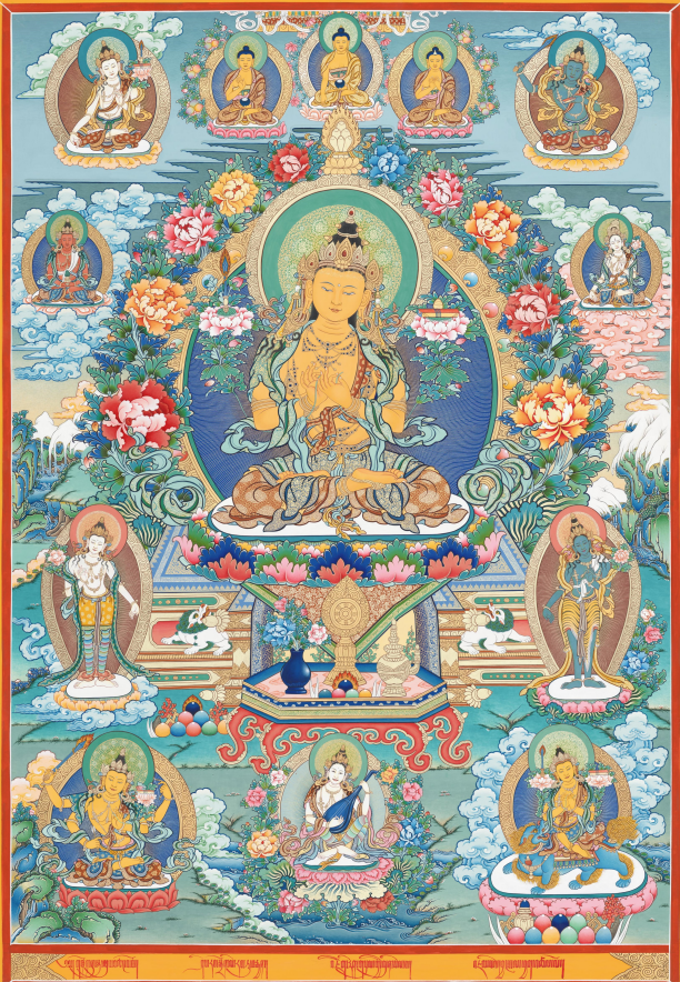 唐卡上部五位从左到右分别是四臂观音、燃灯佛、释迦牟尼佛、弥勒佛(这三尊称为三世佛),中上两尊从左到右分别是绿度母、白度母,中下两尊从左到右分别是文殊菩萨、金刚手,下方三尊从左到右分别是普贤菩萨、财宝天王、虚空藏菩萨。