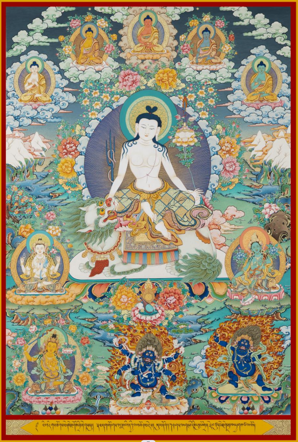 文殊菩萨被誉为“大智”和“法王子”。他是佛陀释迦牟尼的左胁侍,以其卓越的智慧和辩才闻名于世。顶有五髻,代表五智(法界体性智、大圆镜智、平等性智、妙观察智、成所作智),右手持金刚宝剑,象征着用智慧断烦恼,左手持青莲花,花上放有《般若经》,代表智慧的思维。上方从左至右为白文殊、燃灯佛、释迦牟尼佛、弥勒佛,蓝文殊,中上为长寿佛和白度母,中下为观音菩萨和金刚手菩萨,下方为四臂文殊、妙音佛母、骑狮文殊,也称为五部文殊。