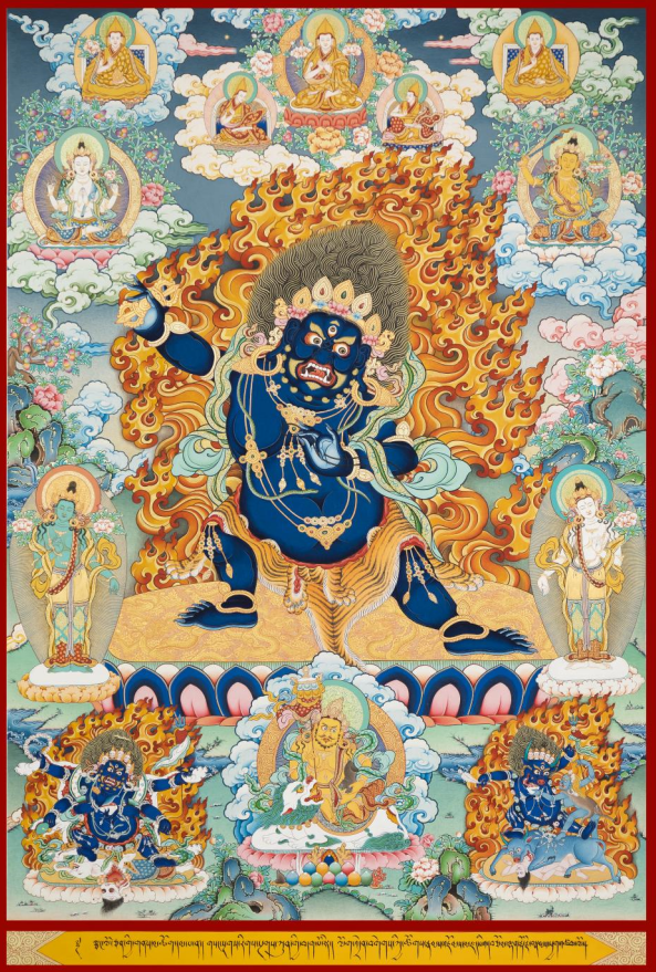 金刚手菩萨,因手执金刚杵,常侍卫于佛,故称之为金刚手菩萨,具有除恶降魔的广大神力,与观世音菩萨、文殊菩萨合称“三族姓尊”,分别代表诸佛“力量、慈悲、智慧”三种特质。一面二臂三目,身黑蓝色,头戴五股骷髅冠,发赤上扬,须眉如火,獠牙露齿卷舌,三红目圆睁,十分怖畏,右手施期勉印,持金刚杵,左手忿怒拳印,持金刚钩绳当胸,以骨饰与蛇饰为庄严,蓝缎与虎皮为裙,双足右屈左伸,威立在莲花日轮座上,于般若烈焰中安住。上界为宗喀巴大师和传承上师及两位弟子,中上为四臂观音、文殊菩萨,中下为绿度母和白度母,下方为六臂玛哈嘎拉、财宝天王、阎罗护法。