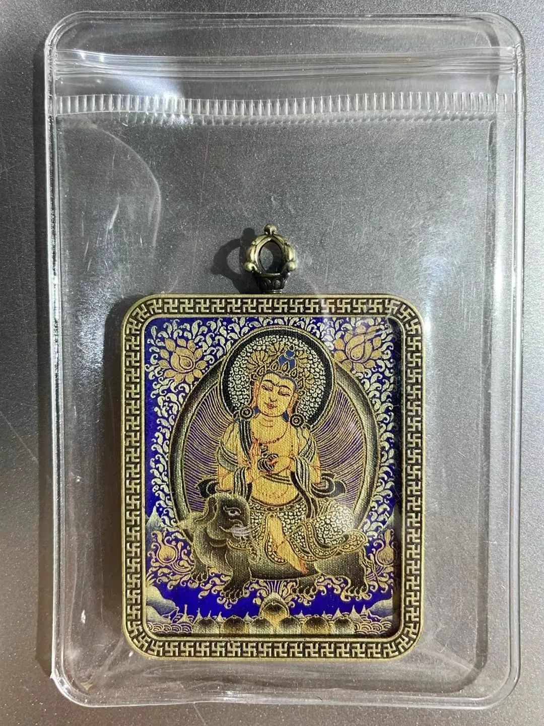 普贤菩萨,又称遍吉菩萨,是大乘佛教的四大菩萨之一,象征着理德、行德,与象征着智德、正德的文殊菩萨相对应,普贤菩萨是礼德和大行愿的象征,他的形象常常是一手执青莲,一手伸掌施无畏印,骑六牙白象,是普贤菩萨愿行广大,功德圆满的象征。普贤菩萨的象具有巨大无比的威力,代表法身负荷一切众生;白色象征无漏无染;六牙代表六度,即布施、持戒、忍辱、精进、禅定、智慧;四足表示四如意,即四种禅定。上方为五方佛菩萨,中下为长寿佛和绿度母,下方为白度母、白六臂玛哈嘎拉、尊胜佛母。