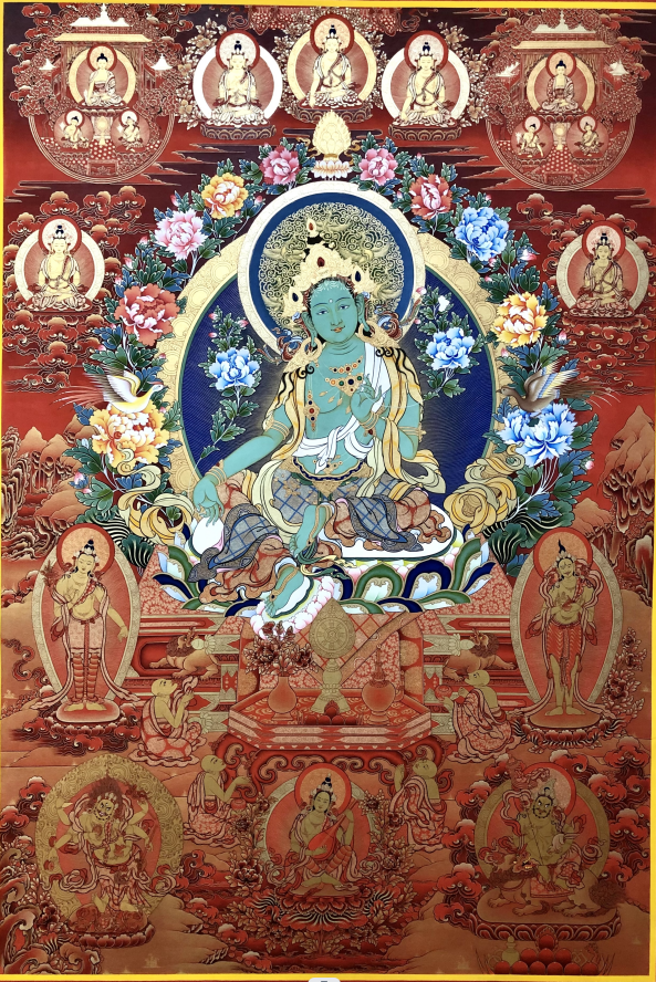 绿度母为观世音菩萨的化身,她能救八种苦难,如火难、狮难、象难、蛇难、水难、牢狱难、贼难、非人难,又称为“救八难度母”。同时,还能把称为五毒的人类行为贪、嗔、痴、慢、疑中的“疑”转成究竟圆满的智慧,有护持妇女幼儿的功德。绿度母造像为菩萨装,坐菩萨座于莲花月轮上,左腿单坐,右腿向下舒展,踏在莲花上,右手持乌巴拉花(蓝莲花),向外置于膝前,掌心向外,作施愿印,此印有施予、令如愿、赐护及普度的意义,左手亦拈支盛开着的乌巴拉花(蓝莲花),置于胸前作三宝印,其竖起的三指的食指表义佛宝,中指表义法宝,小指表义僧宝。拇指及无名指碰触着,表义悲智双运。上方从左至右分别为药师净土、三世佛、阿弥陀佛净土,中下两尊为绿度母的两位弟子,下方为白六臂玛哈嘎拉、妙音佛母、财宝天王。