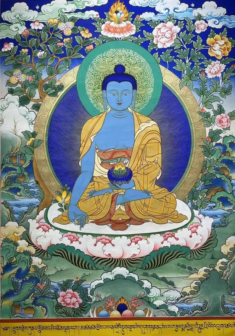 形象:左手掌心向上托钵盛甘露十二大愿之妙药,以度脱众生,右手结胜施印手掌向前,拇指与食指捻一枝带叶的如拉(藏青果),也可以理解为药王树,身穿袈裟,结跏趺坐在莲花宝台上。