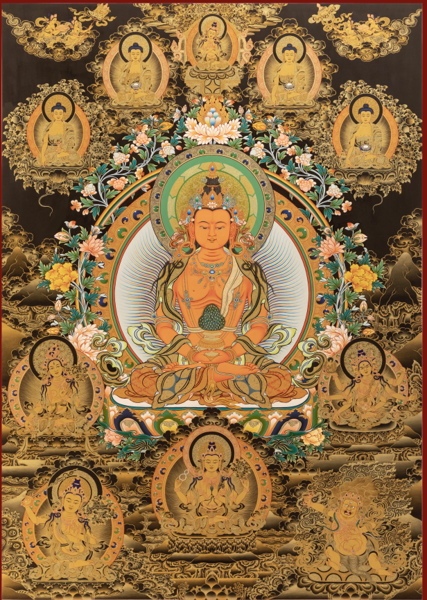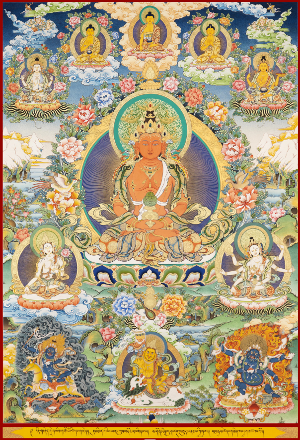 "长寿佛"是藏传佛教中对"圣无量寿智决定光明王如来"的略称,亦简称为"无量寿智如来",其画像为一面二臂,肌肤红色,盘发成髻戴五佛宝冠,上穿天衣,下著绸裙,身佩珍宝璎珞,具足一切报身佛的种种庄严,双手结禅定印于膝上,托长寿宝瓶,双足以金刚双跏趺安住于莲花月轮上。上方从左到右分别是燃灯佛、释迦摩尼佛、弥勒佛,中上左右两尊分别是两尊四臂观音,中下方为白度母和尊胜佛母,下方从左到右分别是吉祥天母、财宝天王和六臂玛哈嘎拉,这幅唐卡也称为长寿三尊。