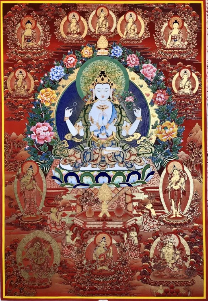 本尊身颜洁白如月,头戴五佛冠,发黑色结髻,中央二手合掌于胸前,捧有摩尼宝珠,右手持水晶念珠。左手拈八瓣莲花与耳际齐,面貌寂静含笑。以菩萨慧眼凝视众生,凡被其观者尽得解脱。全身花蔓庄严,跏趺坐于莲花月轮上,身发极大五彩光,明朗照耀。上方为三世佛,中上为长寿佛、绿度母,中下为白度母、尊胜佛母,下方为文殊菩萨、吉祥天母、金刚手菩萨,这幅唐卡也称为三怙主。
