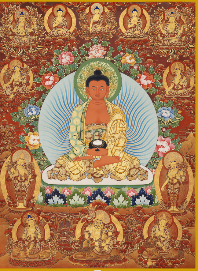 阿弥陀佛即无量寿佛,身着天衣,饰璎珞,跏趺坐于仰莲座之上,身着袈裟,阿弥陀佛红色身,双手托钵,现禅定相。身后佛光中发丝般细腻的渐变虹光亦是高阶画师才能驾驭的非凡技法。画面人物构图均衡、丰满、多变,栩栩如生,惊艳非凡。