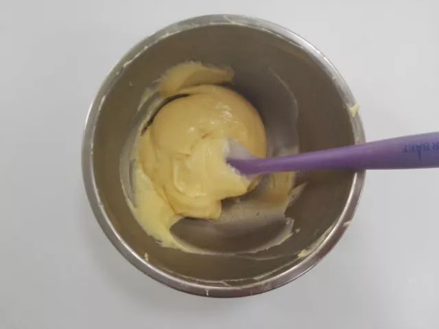 12.时不时用刮刀挑起面糊,如果面糊呈倒三角形状,并且不会滑落,就表示OK了,剩下的蛋液可以不用再继续加了