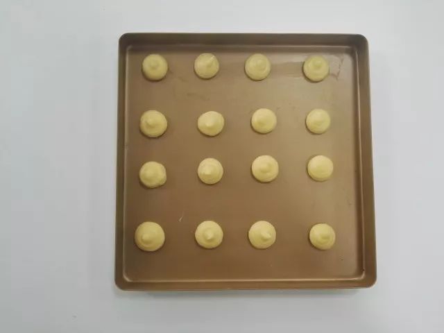 15.把烤盘送入预热好180度的烤箱中烤10-15分钟。当泡芙完全膨胀起来以后,再把温度降低到160度,继续烤20-30分钟,直到表面黄褐色就可以出炉了