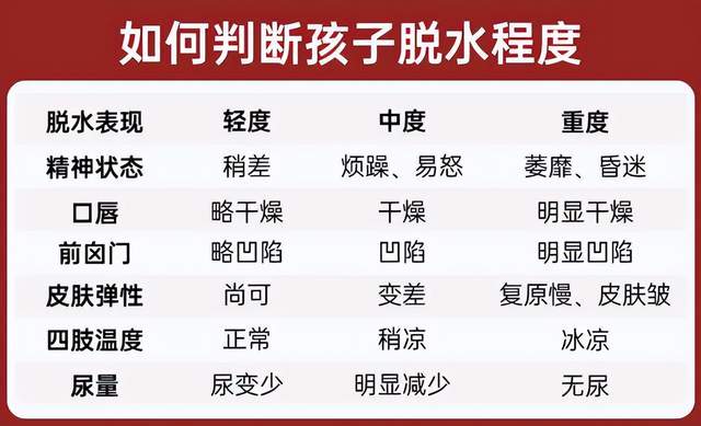 孩子在腹泻期间,一定要观察是否有脱水的表现,脱水一般分轻度、中度和重度。如果出现中、重度缺水,需及时就医。