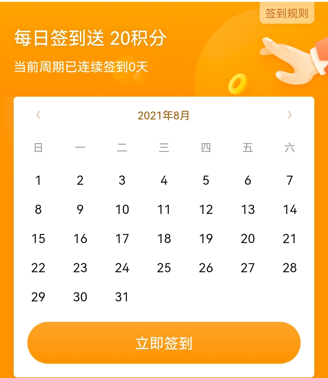 注册成为我们的会员之后,除了购买消费能积攒积分,我们还有不定期活动送大额积分,签到也有积分赠送哦!