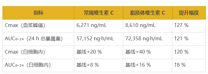 500 mg 脂质体维生素 C 较同剂量常规维生素 C,血浆总暴露量提高 21 %,峰值提高 27 %,白细胞内维生素 C 也显著升高。