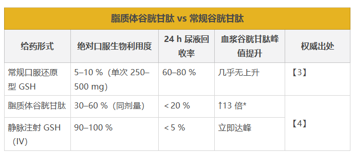 常规口服因胃酸、消化酶破坏,吸收率常低于 10 %,临床几乎检测不到血浆 GSH 上升 。