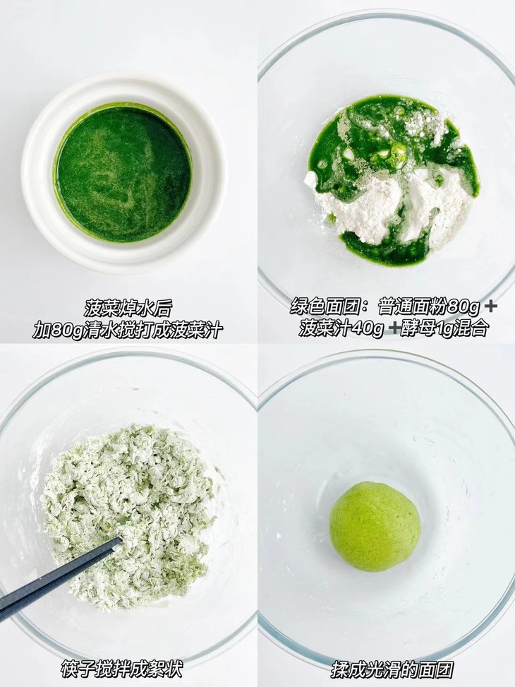 ❸绿色面团:普通面粉80g➕菠菜汁40g➕酵母1g混合,用筷子搅拌成絮状,再下手揉成光滑的面团。